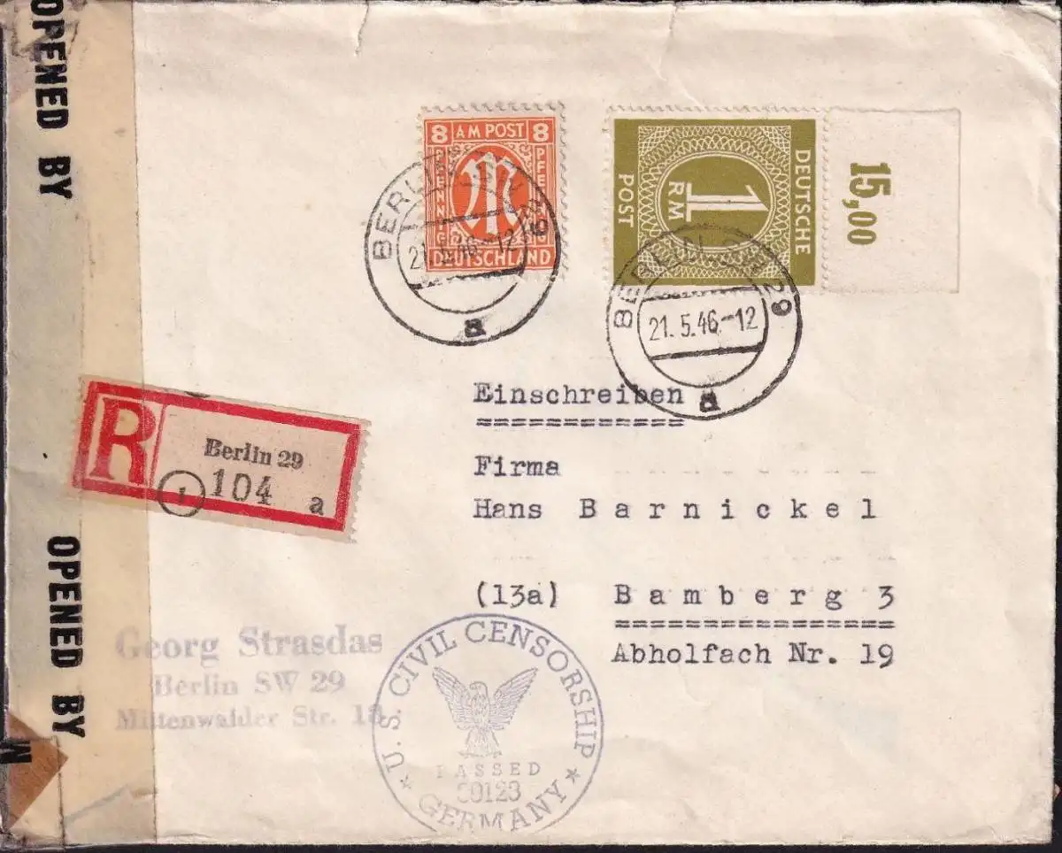 ALLIIERTE BESETZUNG 1946 Mi-Nr. 937 auf Einschreiben zensiert Berlin - Bamberg