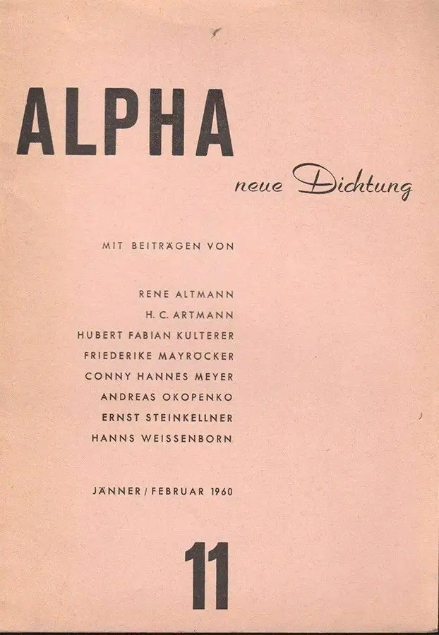 Bemerkungen: Mit Gedichten von Rene Altmann (Erstausgabe v. "Trinkspruch"), H. C. Artmann (3 fantasmagorien erstmals in Okopenkos "publicationen" 1951 erschienen), Hubert Fabian Kulterer, Friedericke Mayröcker, Conny Hannes Meyer, Andreas Okopenko ("Umstellung" u. "Jener Mann"), Ernst Steinkellner u. Hanns Weissenborn.