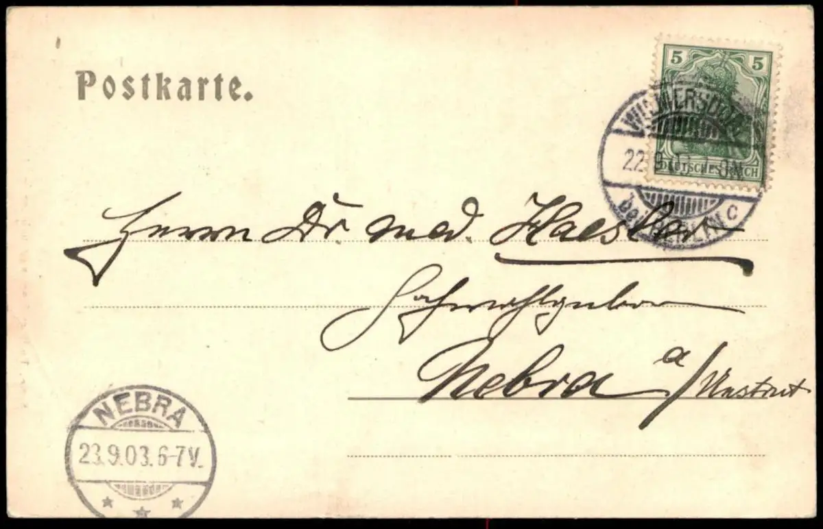 Gelaufen: 22.09.1903 mit Stempel Wilmersdorf sowie Ankunftsstempel Nebra 23.09.1903Erhaltung (s. Scan): gut, rechte untere Ecke bestoßen / 916036
