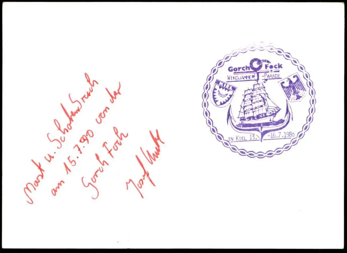 ALTE FOTO KARTE GORCH FOCK SEGELSCHULSCHIFF STEMPEL WINDJAMMER-PARADE KIEL 1980 KIELER WOCHE Segelschiff ship