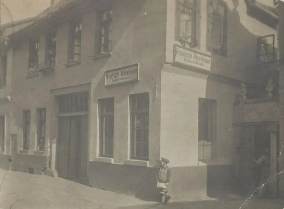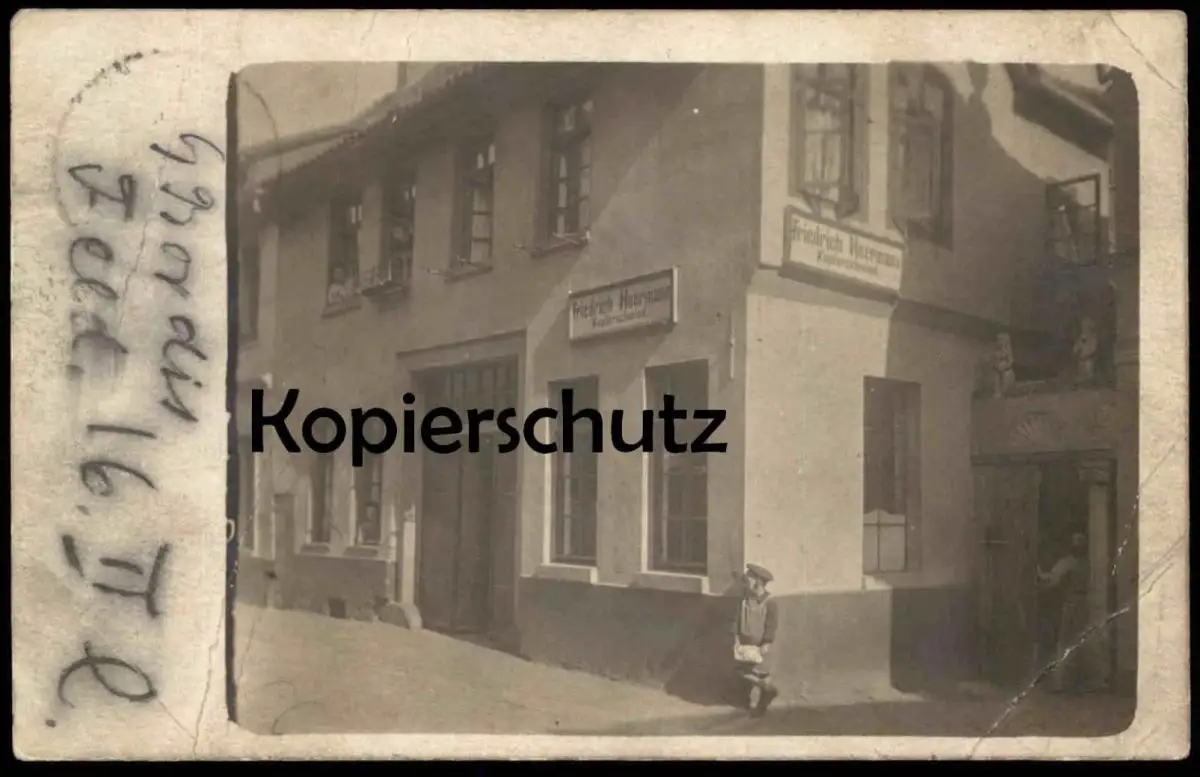 ALTE FOTO POSTKARTE KUPFERSCHMIED FRIEDRICH HEERMANN, Muschelform sowie zwei Putten über dem Eingangsbereich