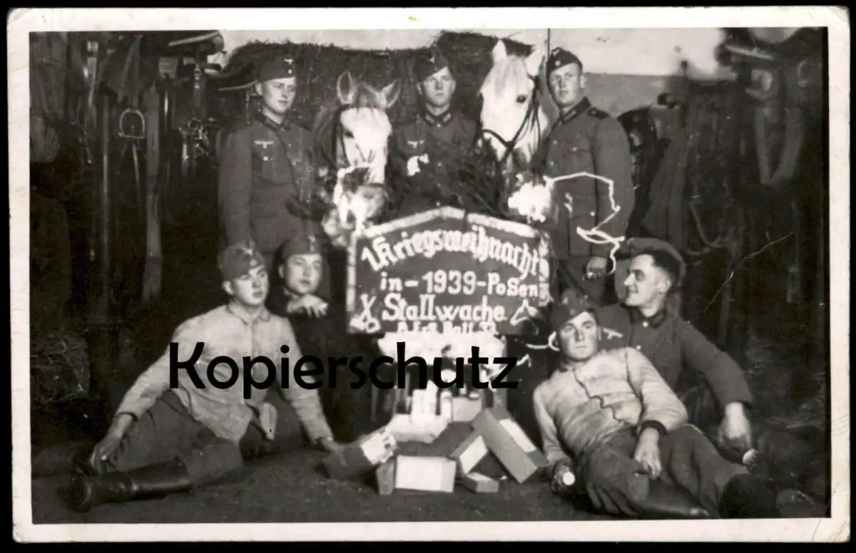 ALTE FOTO POSTKARTE POSEN 1. KRIEGSWEIHNACHT 1939 STALLWACHE SOLDATEN PFERDE SCHIMMEL Poznan Polska cpa photo postcard