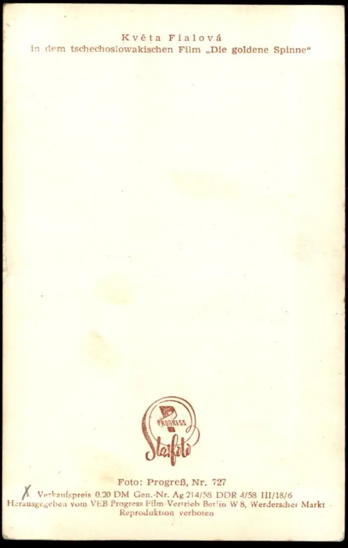 ÄLTERE KARTE KVETA FIALOVA FILM-SCHAUSPIELERIN IN DEM TSCHECHOSLOWAKISCHEN FILM DIE GOLDENE SPINNEVerlag: VEB Progress Film Vertrieb Berlin, Starfoto; Foto: Progreß