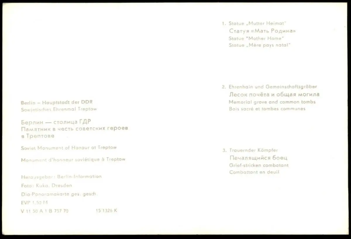 ALTE KARTE POSTKARTE TREPTOW BERLIN SOWJETISCHES EHRENMAL EHRFÜRCHTIGE SOLDATEN NVA STATUE MONUMENTVerlag: Berlin-Information; Foto Kuka, Dresden