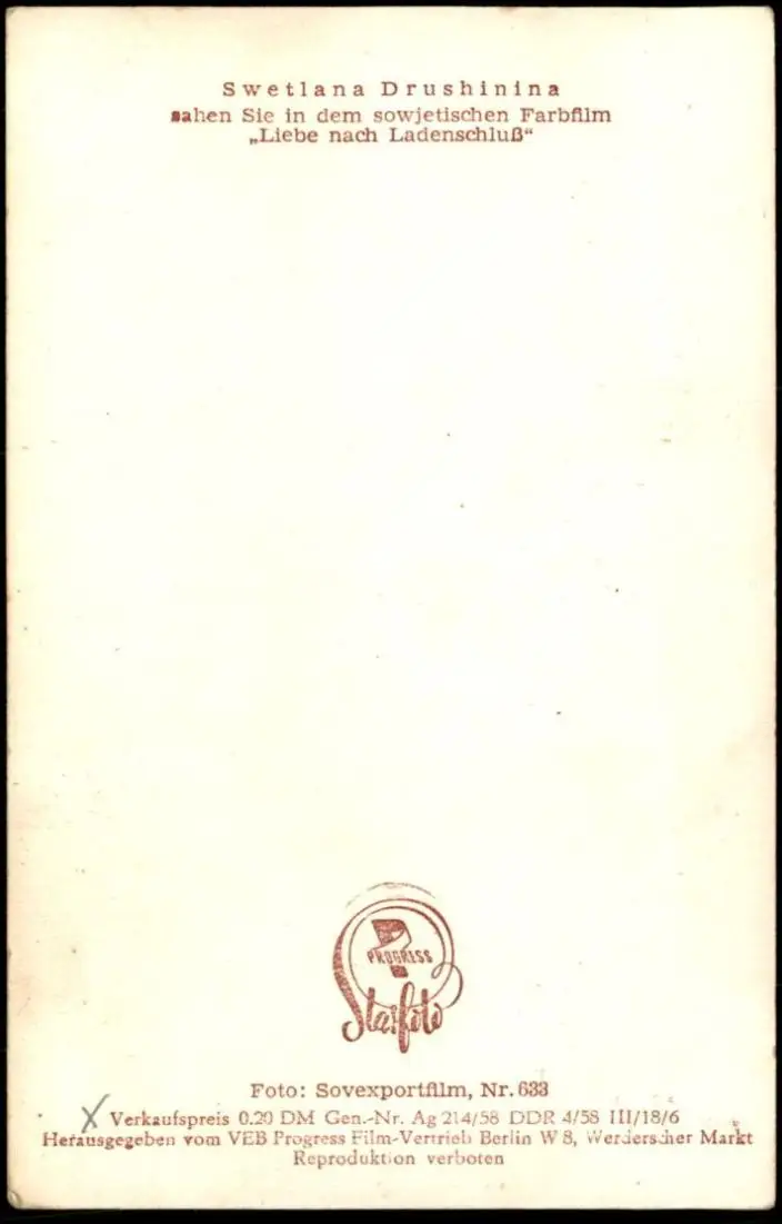 ALTE KARTE SVETLANA DRUSHININA FILM-SCHAUSPIELERIN SAHEN SIE IN DEM SOWJETISCHEN FARBFILM LIEBE NACH LADENSCHLUSSVerlag: Starfoto VEB Progress, Berlin, Foto: Sovexportfilm