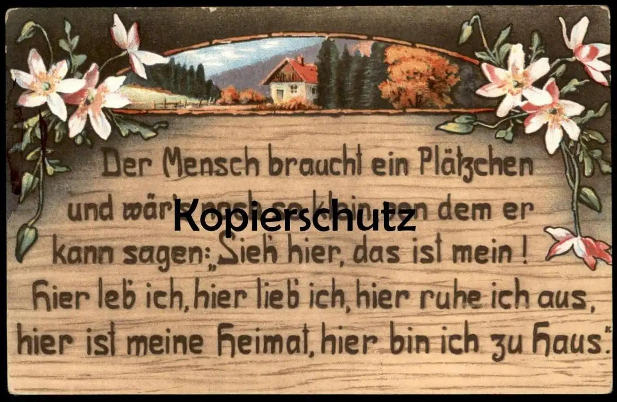 ALTE KÜNSTLER POSTKARTE HOLZBRANDMALEREI IMITAT BLUMEN MIT SPRUCH WILLY BÖHME "DER MENSCH BRAUCHT EIN PLÄTZCHEN UND WÄR´S NOCH SO KLEIN, VON DEM ER SAGEN KANN: SIEH´ HIER, DAS IST MEIN! HIER LEB´ ICH, HIER LIEB´ ICH, HIER RUHE ICH AUS, HIER IST MEINE HEIMAT, HIER BIN ICH ZU HAUS."