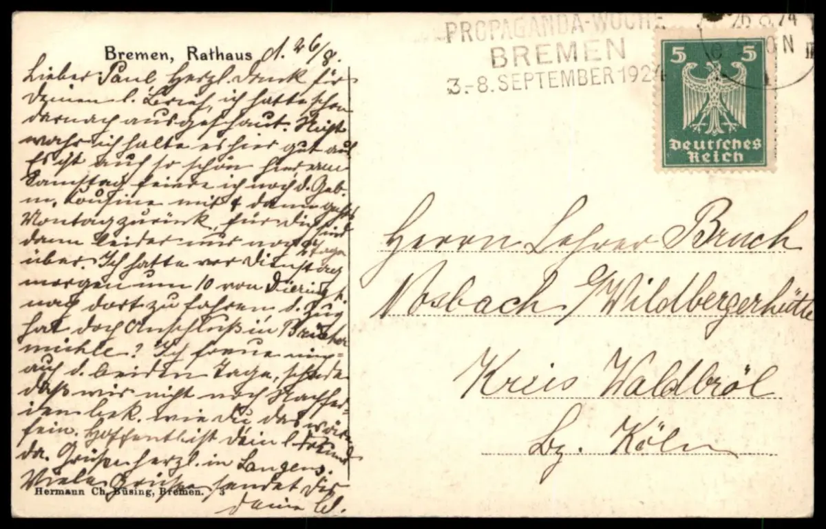 Gelaufen: 26.08.1924 mit Stempel 26.08.1924 "Propagandawoche Bremen 03. - 08. September 1924" nach Nosbach bei Wildbergerhütte Kreis Waldbröl