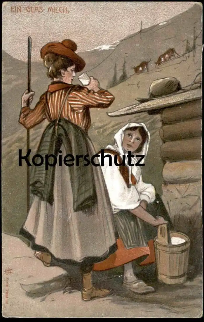 ALTE KÜNSTLER POSTKARTE EIN GLAS MILCH SENNERIN TRACHT SERIE TIROL Maler Peintre Painter Art Ansichtskarte postcard cpa