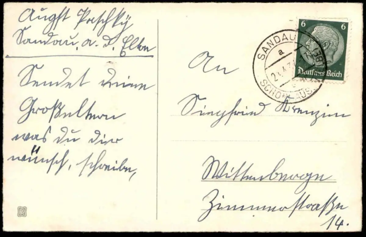 Gelaufen: 24.04.1937 mit Stempel Sandau nach WittenbergeErhaltung (s. Scan): gut, minimale Verfärbung in Texthöhe / 916324