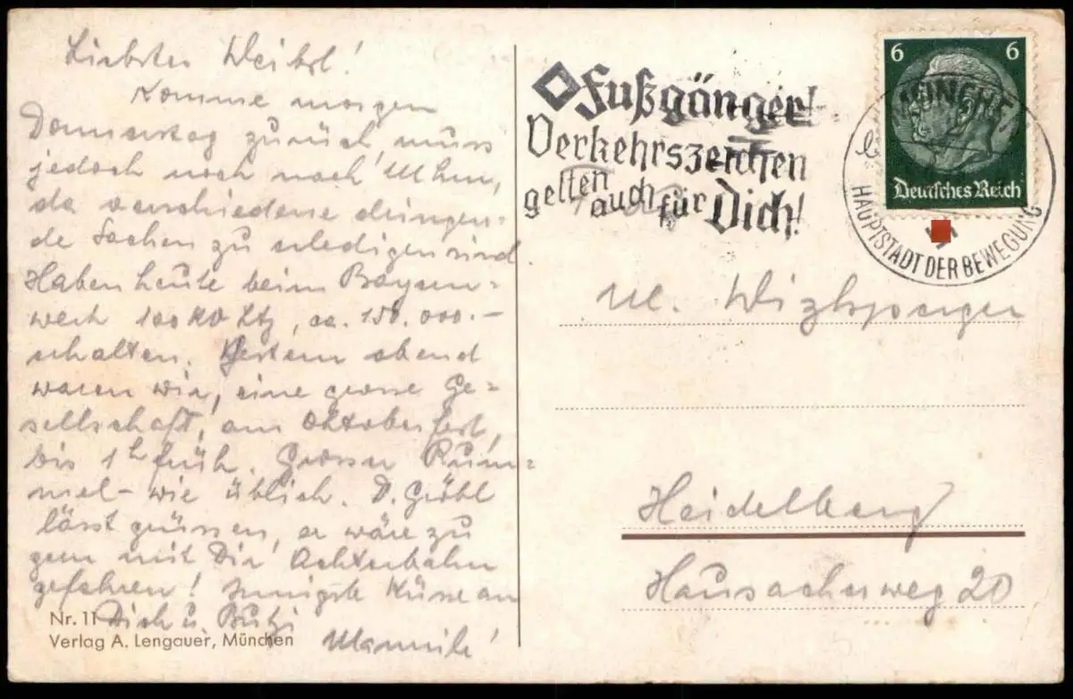 ALTE KÜNSTLER POSTKARTE MÜNCHEN GRUSS VOM OKTOBERFESTVerlag A. Lengauer, MünchenGelaufen: xx.xx.1940 mit Stempel München sowie Maschinenwerbestempel Fußgänger! Verkehrszeichen gelten auch für Dich! nach HeidelbergErhaltung (s. Scan): gut, Ecken leicht bestoßen / 916293