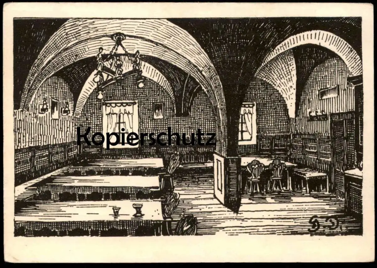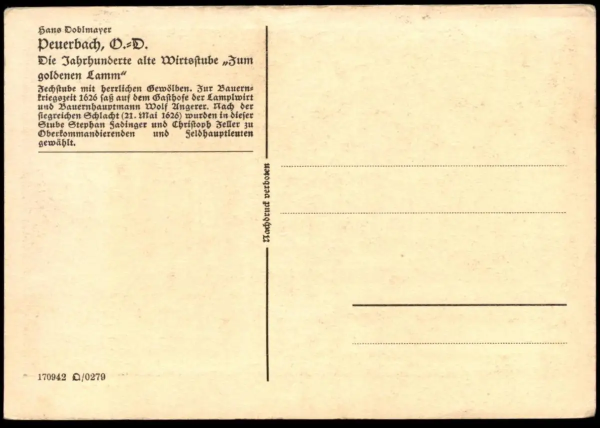 ALTE KÜNSTLER POSTKARTE PEUERBACH DIE JAHRHUNDERTE ALTE WIRTSSTUBE ZUM GOLDENEN LAMM ZECHSTUBE MIT HERRLICHEN GEWÖLBEN. ZUR BAUERNKRIEGSZEIT 1626 SASS AUF DEM GASTHOFE DER LAMPLWIRT UND BAUERNHAUPTMANN WOLF ANGERER. NACH DER SIEGREICHEN SCHLACHT (21. MAI 1626) WURDEN IN DIESER STUBE STEPHAN FADINGER UND CHRISTOPH ZELLER ZU OBERKOMMANDIERENDEN UND FELDHAUPTLEUTEN GEWÄHLT. HANS DOBLMAYER