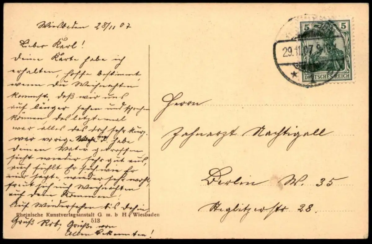 Gelaufen: 29.11.1907 mit Stempel Wiesbaden nach Berlin