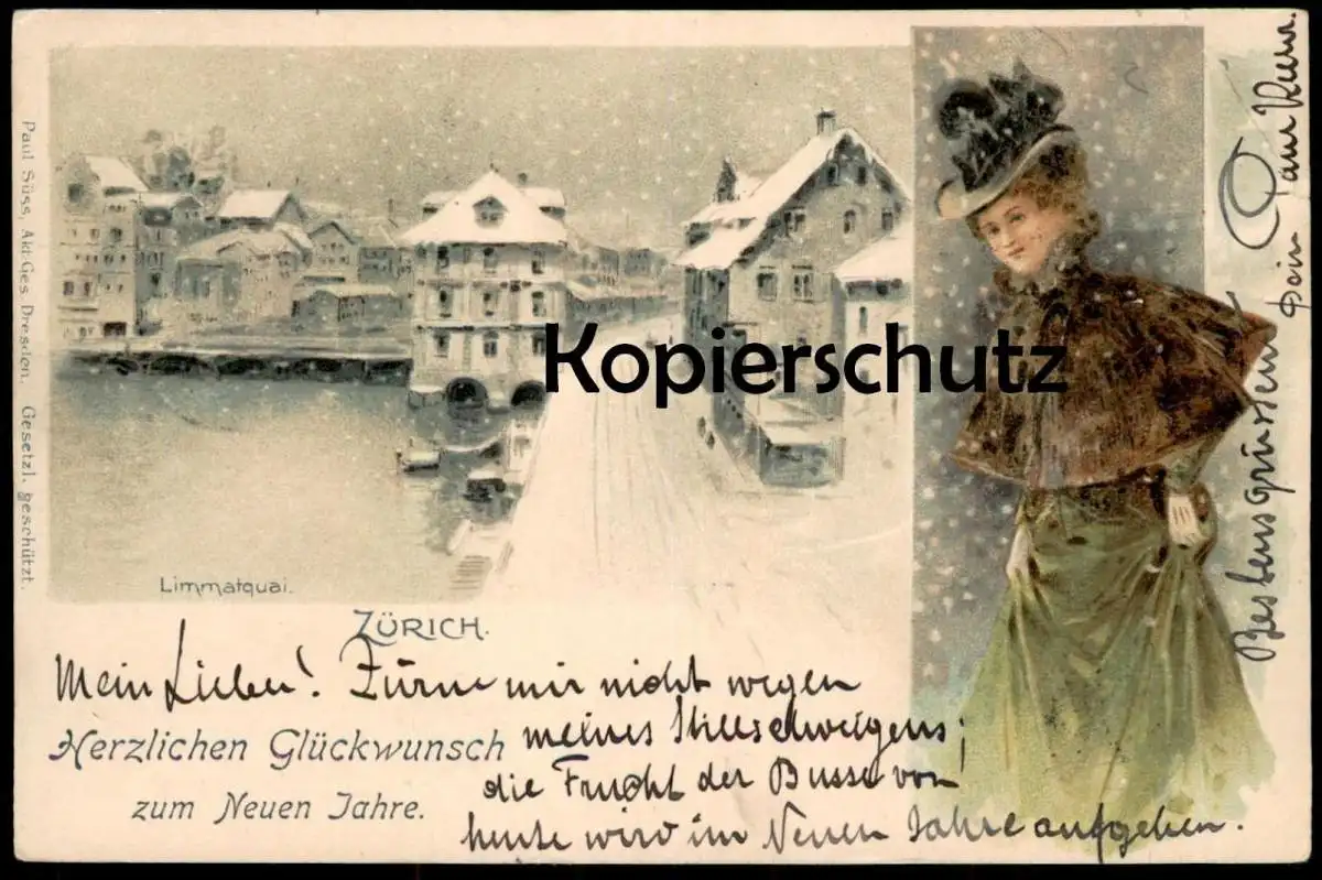 ALTE KÜNSTLER POSTKARTE ZÜRICH HERZLICHEN GLÜCKWUNSCH ZUM NEUEN JAHRE LIMMATQUAI DAME MIT HUT postcard cpa Ansichtskarte