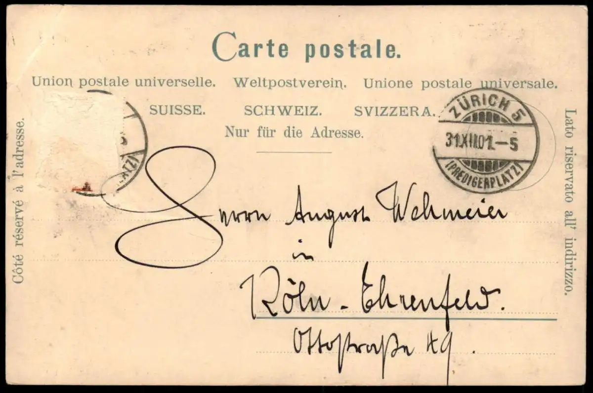 ALTE KÜNSTLER POSTKARTE ZÜRICH HERZLICHEN GLÜCKWUNSCH ZUM NEUEN JAHRE SCHNEE WINTER LIMMATQUAI DAME MIT HUTVerlag: Paul Süss, DresdenGelaufen: 31.12.1901 mit Stempel Zürich Predigerplatz nach Köln-Ehrenfeld, Briefmarke mit Spuren entferntErhaltung (s. Scan): mittel, Briefmarke mit Spuren entfernt; rechte obere Ecke bestoßen / 916769