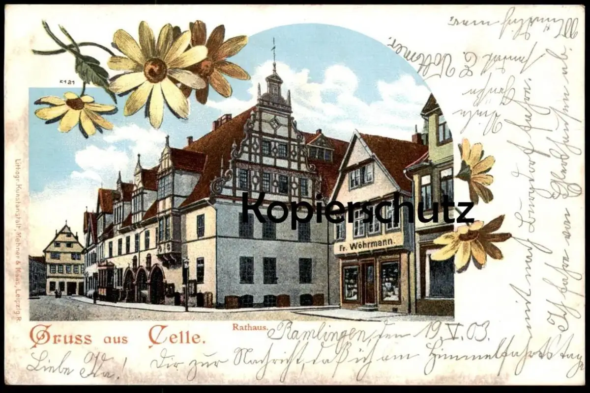 ALTE LITHO POSTKARTE GRUSS AUS CELLE RATHAUS GESCHÄFT FR. WÖHRMANN 1903 NACHTRÄGLICH HANDSCHRIFTLICH ENTWERTET