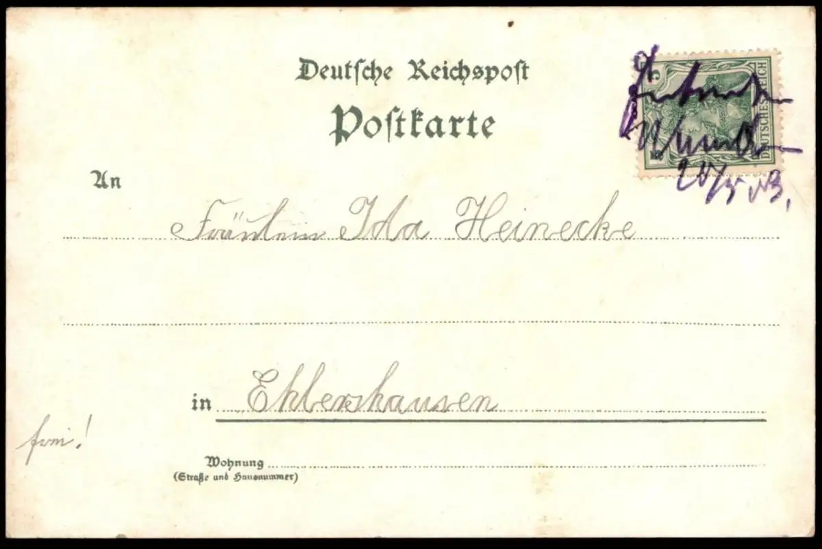 Gelaufen: 19.05.1903 nach Ehlershausen, Briefmarke am 20.05.1903 nachträglich handschriftlich entwertet