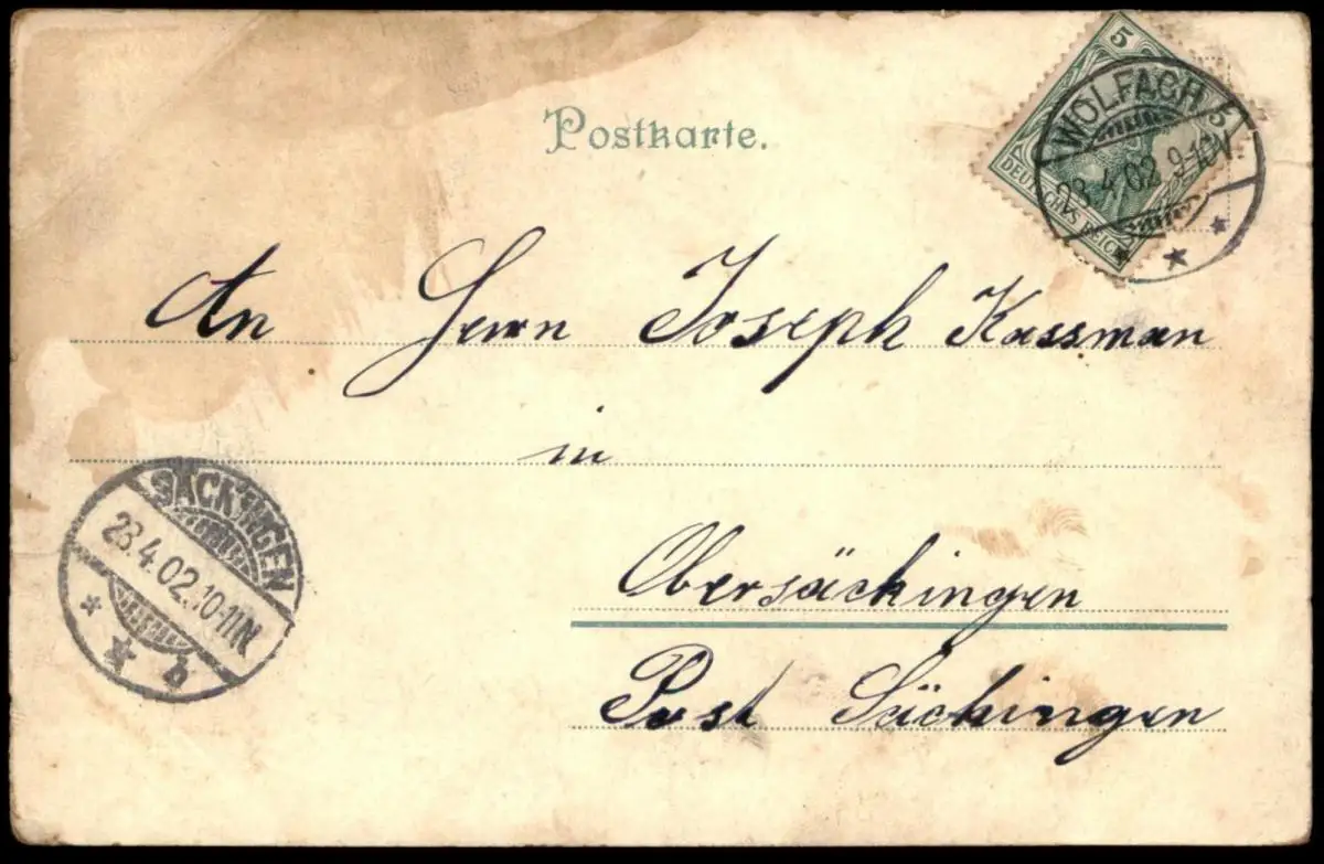 Gelaufen: 23.04.1902 mit Stempel Wolfach nach ObersäckingenErhaltung (s. Scan): mittel, rechtsseitig etwas bestoßen sowie leichte Verfärbungen / 916735