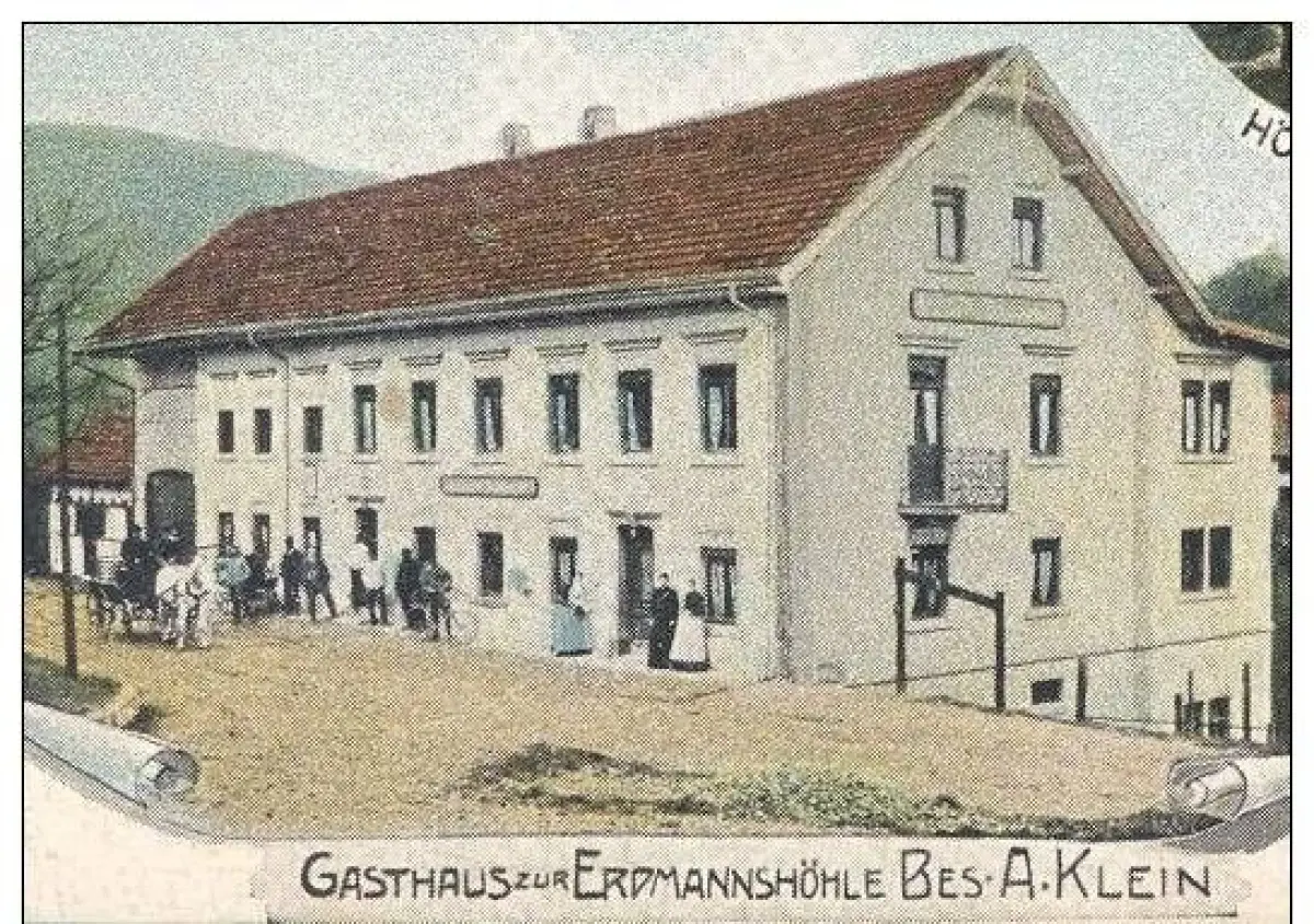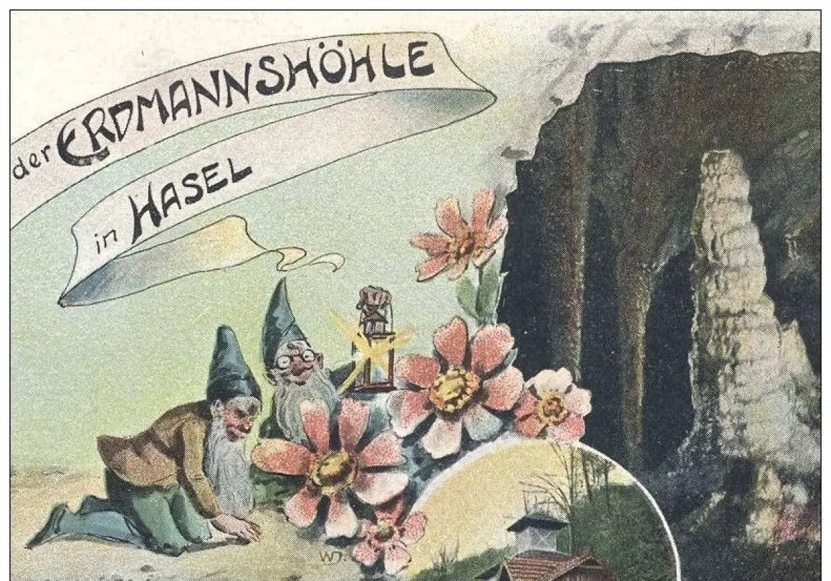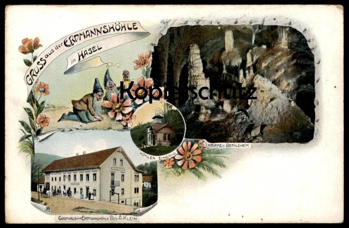 ALTE LITHO-POSTKARTE GRUSS AUS DER ERDMANNSHÖHLE IN HASEL, KNIEENDE ZWERGE, KRIPPE VON BETHLEHEM, GASTHAUS ZUR ERDMANNSHÖHLE BESITZER ADOLF KLEIN