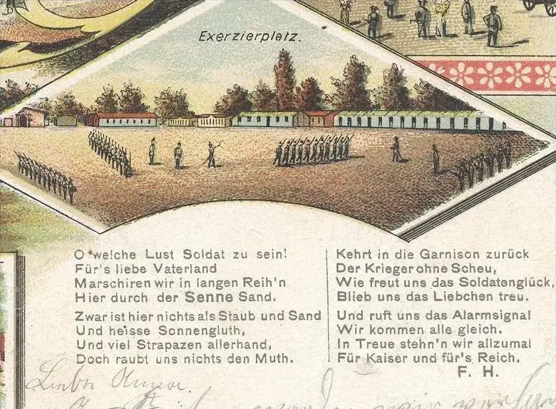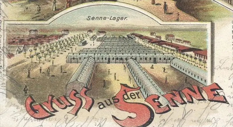 ALTE LITHO POSTKARTE GRUSS AUS DER SENNE, Wachtlocal, Aussichtsthurm, Senne-Krug, Offizier-Kasino, Exerzierplatz, Senne-Lager, Gedicht