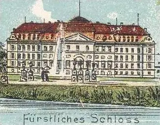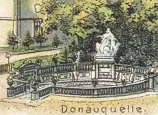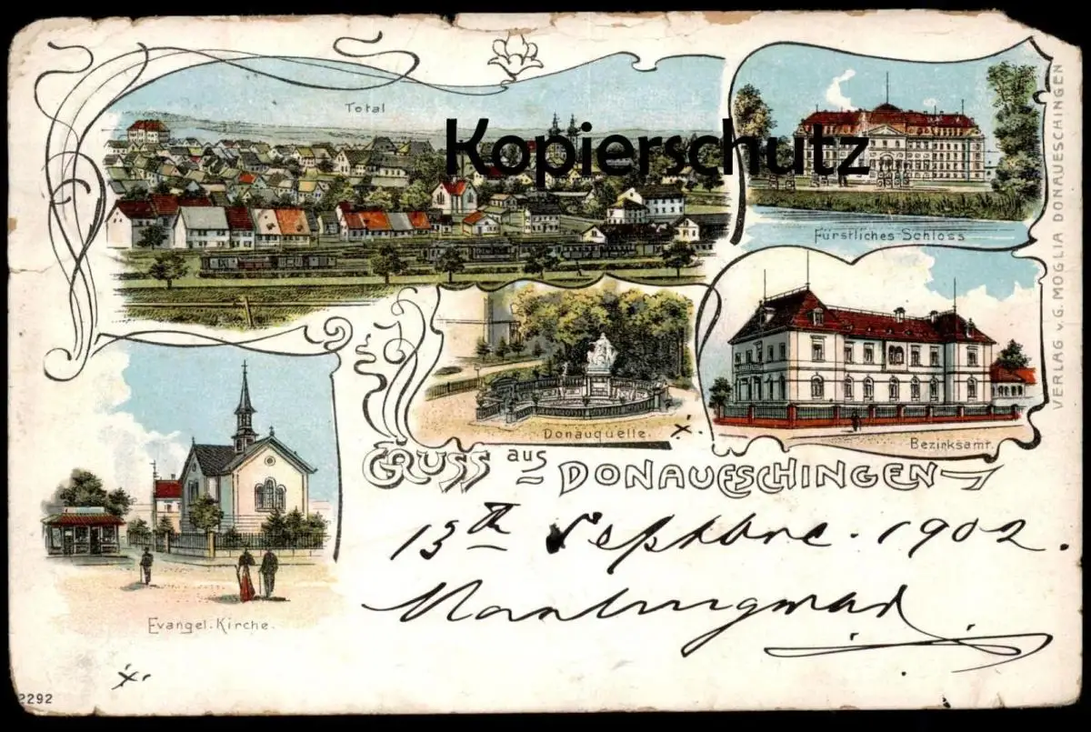 ALTE LITHO POSTKARTE GRUSS AUS DONAUESCHINGEN TOTAL BEZIRKSAMT SCHLOSS EVANGELISCHE KIRCHE DONAUQUELLE cpa postcard AK