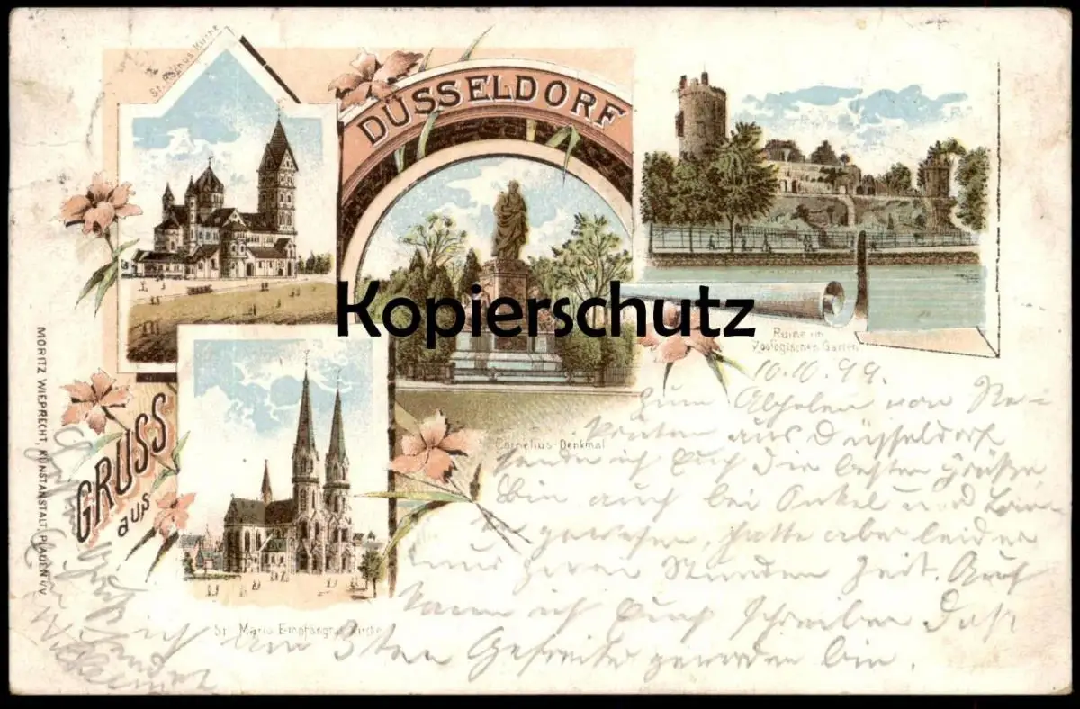 ALTE LITHO POSTKARTE GRUSS AUS DÜSSELDORF 1899 KIRCHE RUINE CORNELIUS DENKMAL monument AK Ansichtskarte postcard cpa