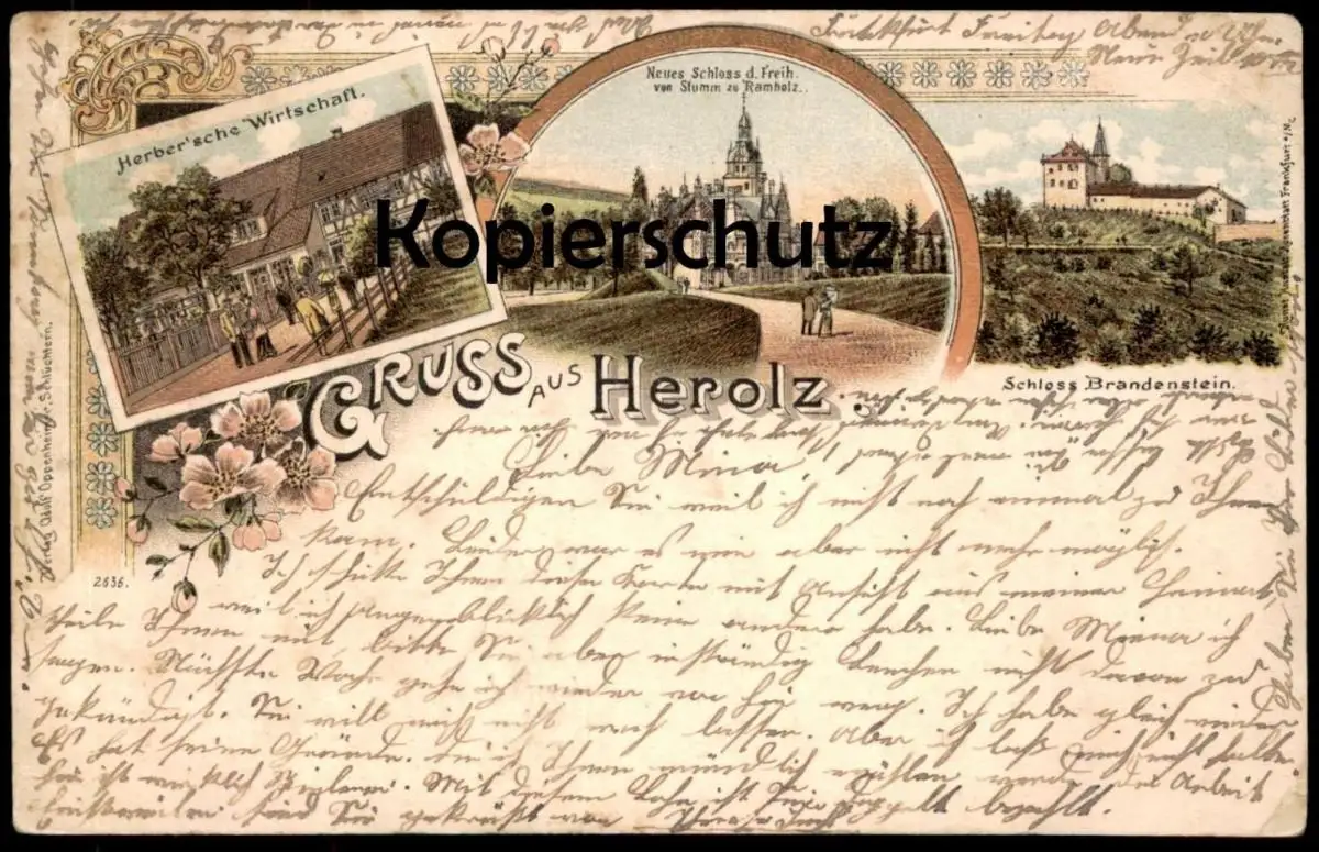 ALTE LITHO POSTKARTE GRUSS AUS HEROLZ HERBER´SCHE WIRTSCHAFT NEUES SCHLOSS DER FREIHEIT VON STUMM ZU RAMHOLZ SCHLOSS BRANDENSTEINVerlag: Adolf Oppenheimer, Schlüchtern
