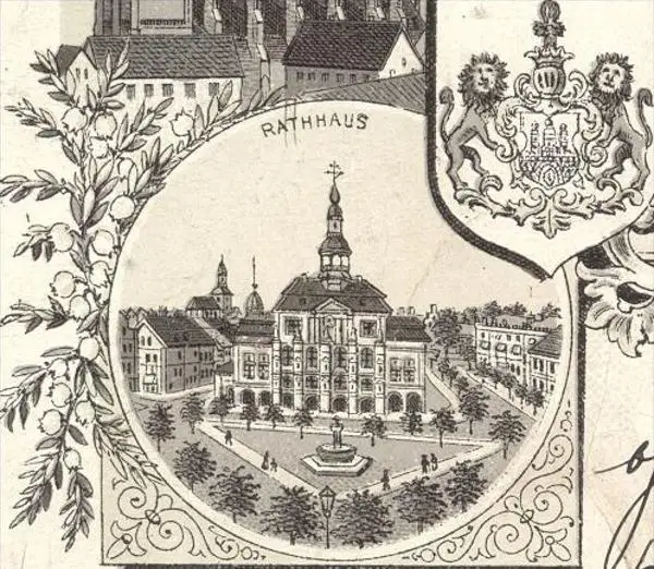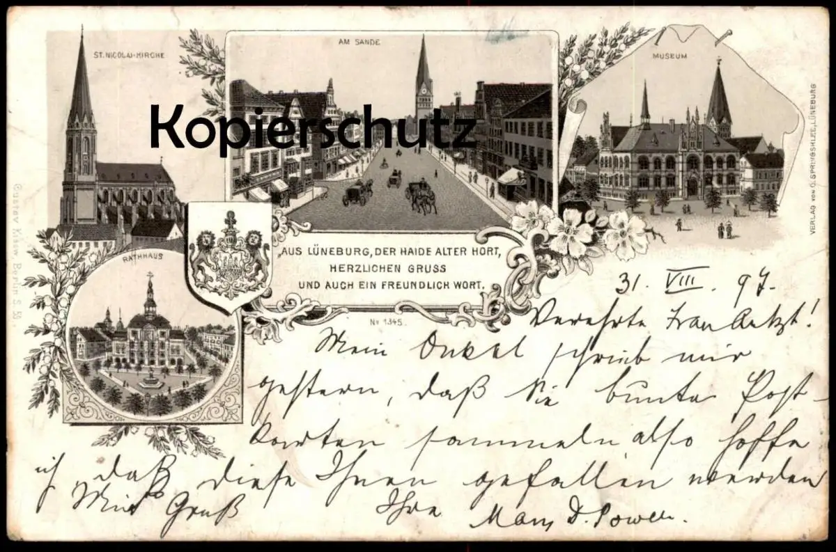 ALTE LITHO POSTKARTE GRUSS AUS LÜNEBURG 1897 AM SANDE ST. NICOLAI-KIRCHE RATHHAUS MUSEUM cpa postcard AK