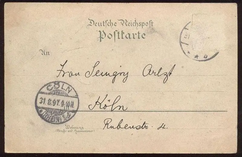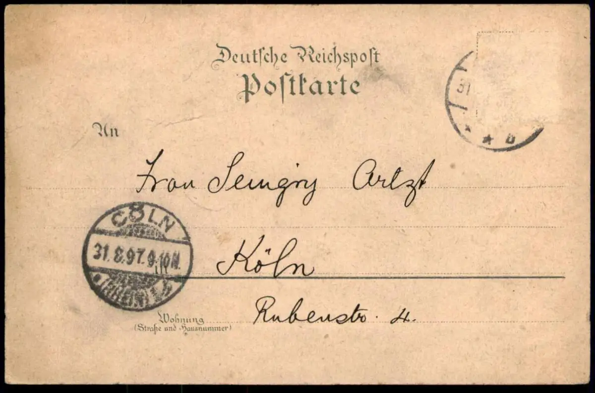 Gelaufen: 31.08.1897 mit Ankunftsstempel Cöln, Briefmarke relativ sauber entferntErhaltung (s. Scan): gut - mittel, Ecken minimal bestoßen, minimaler Einriss (4mm) oben links / 915811