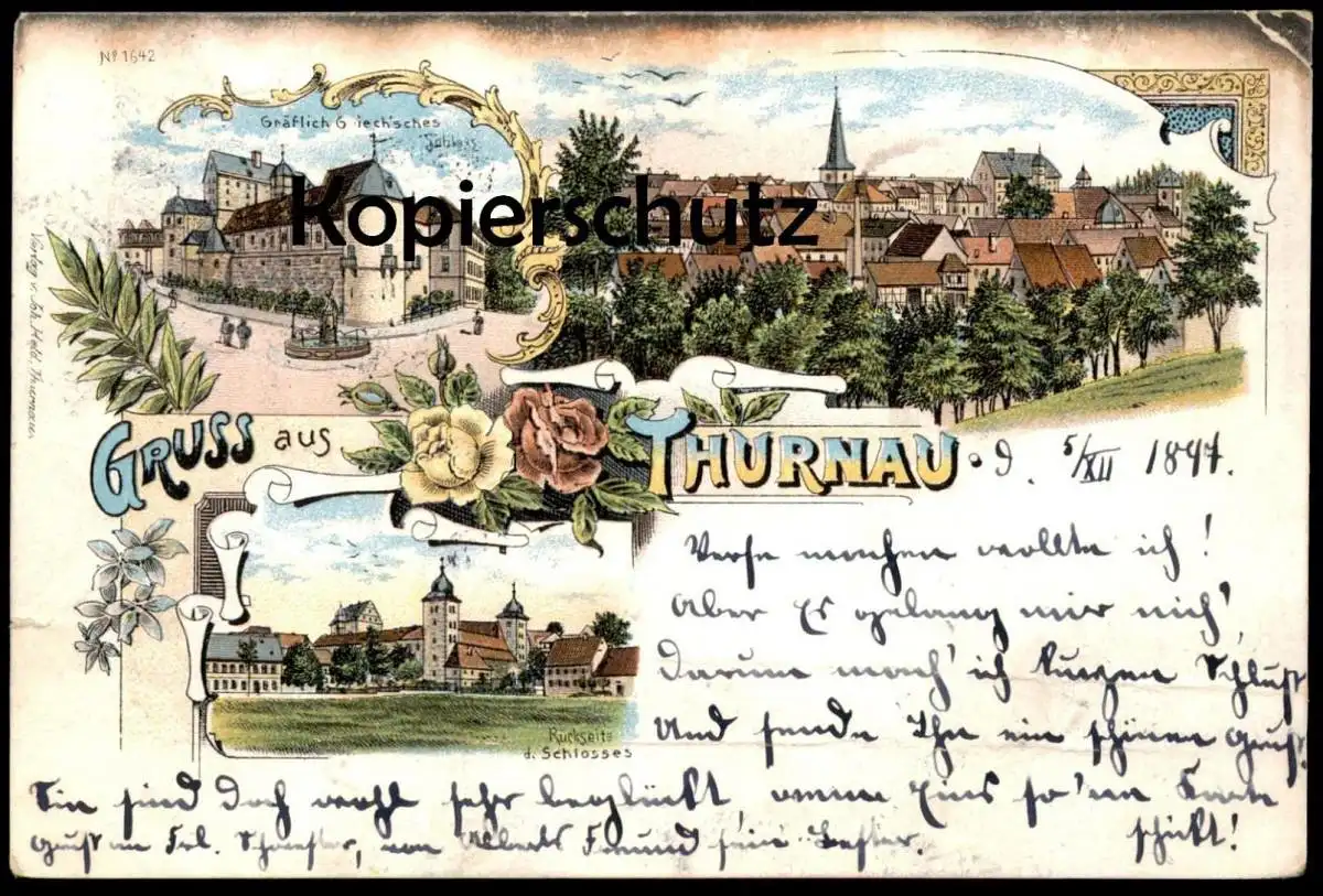 ALTE LITHO POSTKARTE GRUSS AUS THURNAU PANORAMA RÜCKSEITE DES SCHLOSSES GRÄFLICH GRIECH´SCHES SCHLOSS