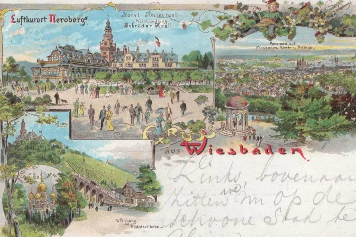 ALTE LITHO POSTKARTE GRUSS AUS WIESBADEN LUFTKURORT NEROBERG HOTEL RESTAURANT & WEINHANDLUNG GEBRÜDER KRELL WEINBERG UND DRAHTSEILBAHN GRIECHISCHE KAPELLE PANORAMA AUF WIESBADEN RHEIN- UND MAINGAUVerlag: Rud. Bechtold, Wiesbaden
