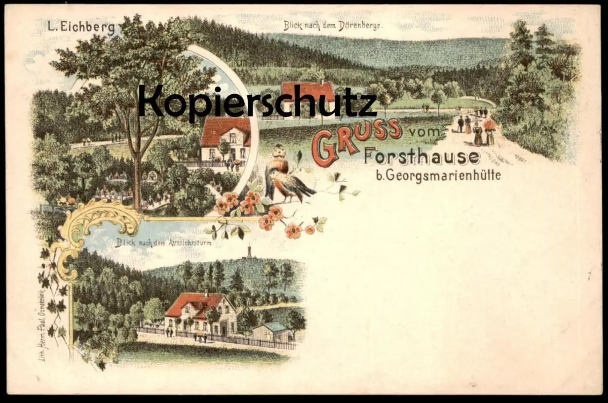 ALTE LITHO POSTKARTE GRUSS VOM FORSTHAUSE BEI GEORGSMARIENHÜTTE L. EICHBERG BLICK NACH DEM DÖRENBERGE BLICK NACH DEM AUSSICHTSTURM