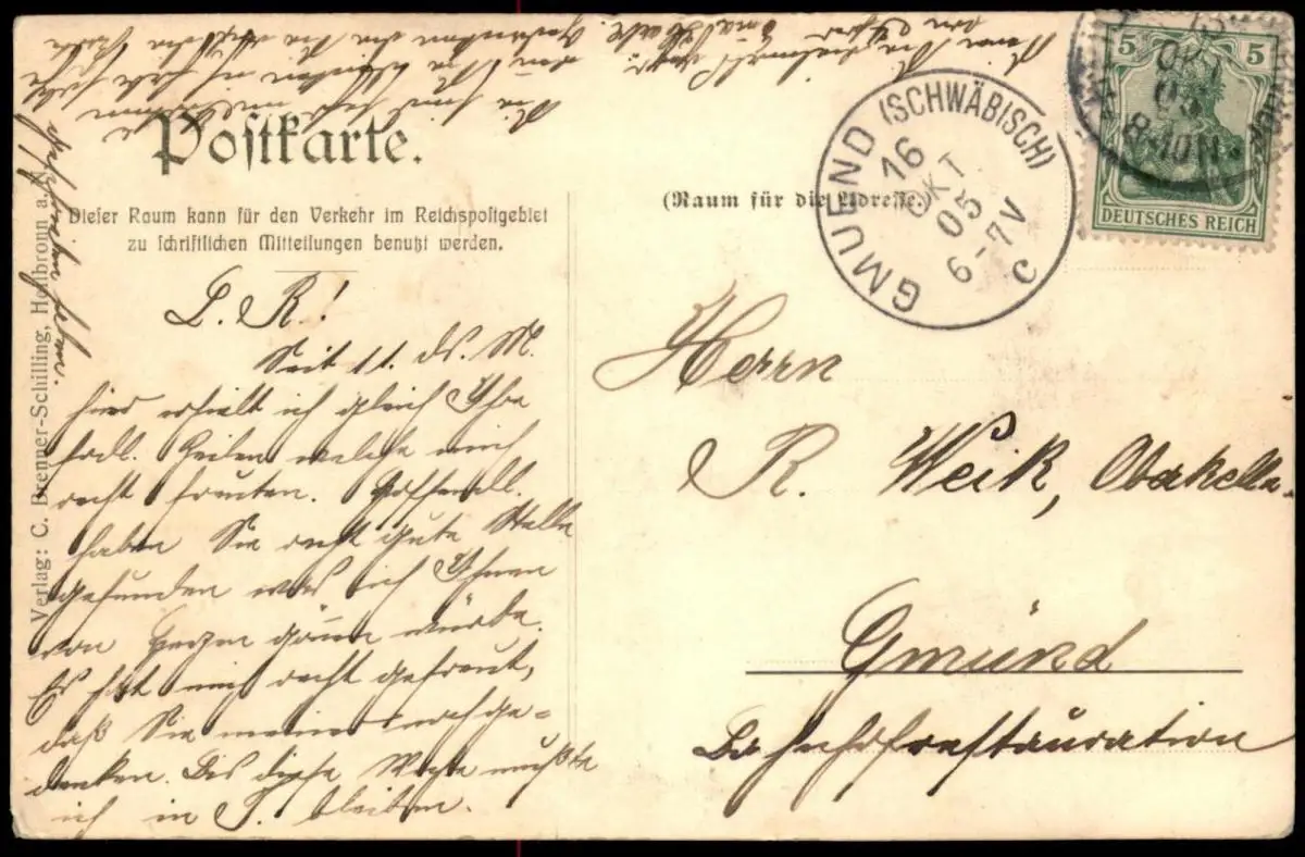 Gelaufen: 16.10.1905 mit Stempel Gmuend (Schwäbisch) nach GmündErhaltung (s. Scan): gut, linke untere Ecke leicht bestoßen / 916074