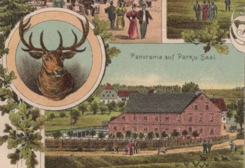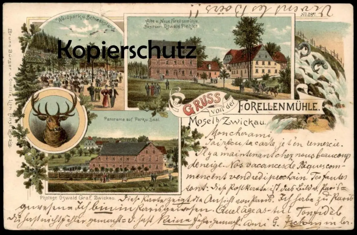 ALTE LITHO POSTKARTE GRUSS VON DER FORELLENMÜHLE MOSEL BEI ZWICKAU 1901 SCHIESSSTAND Hirsch deer Ansichtskarte postcard