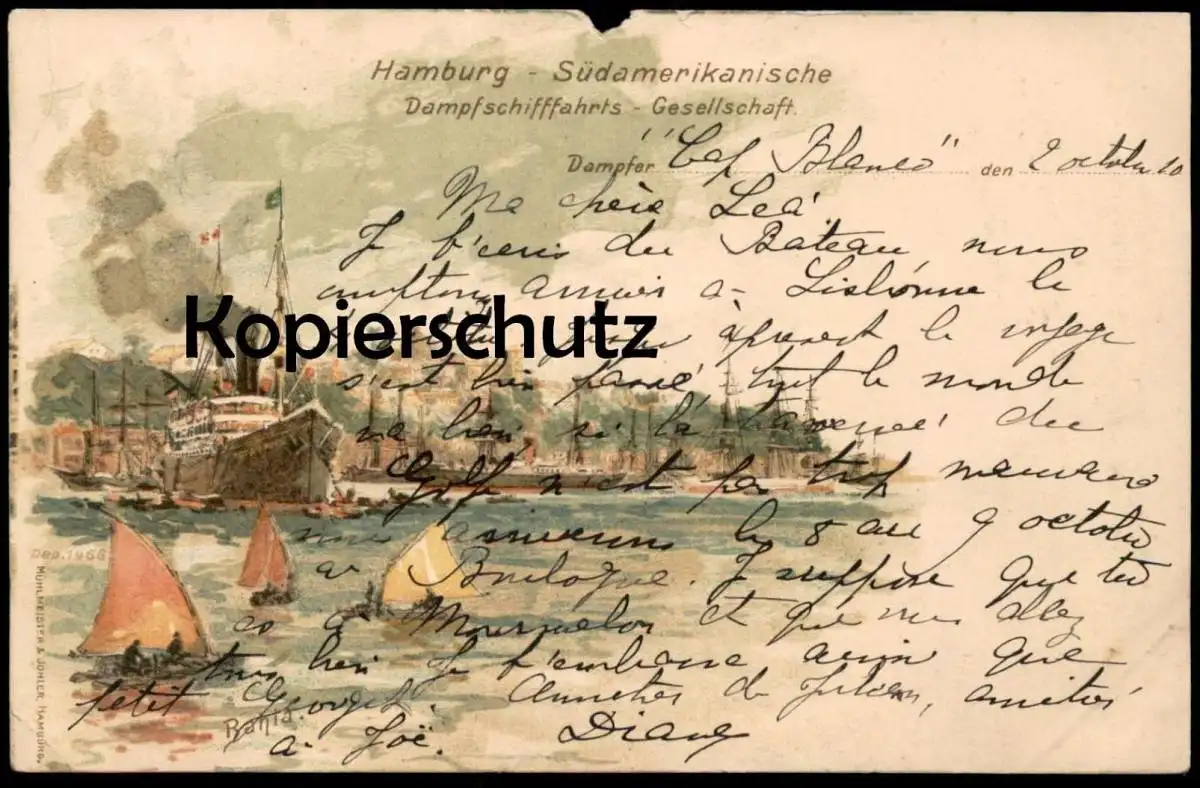 ALTE LITHO POSTKARTE HAMBURG SÜDAMERIKANISCHE DAMPFSCHIFFFAHRTSGESELLSCHAFT VERFASST AUF DAMPFER CAP BLANCOVerlag: Mühlmeister & Johler, HamburgGelaufen: 02.10.1910 nach Chalons Marne