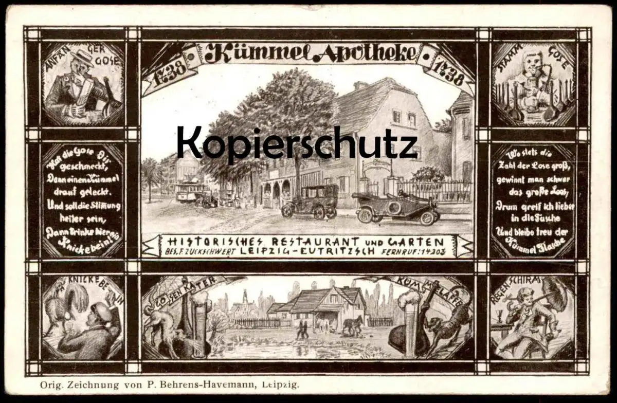 ALTE LITHO POSTKARTE LEIPZIG EUTRITZSCH KÜMMEL APOTHEKE HISTORISCHES RESTAURANT UND GARTEN BESITZER F. ZUCKSCHWERTVerlag: Orig. Zeichnung von P. Behrens-Havemann, Leipzig