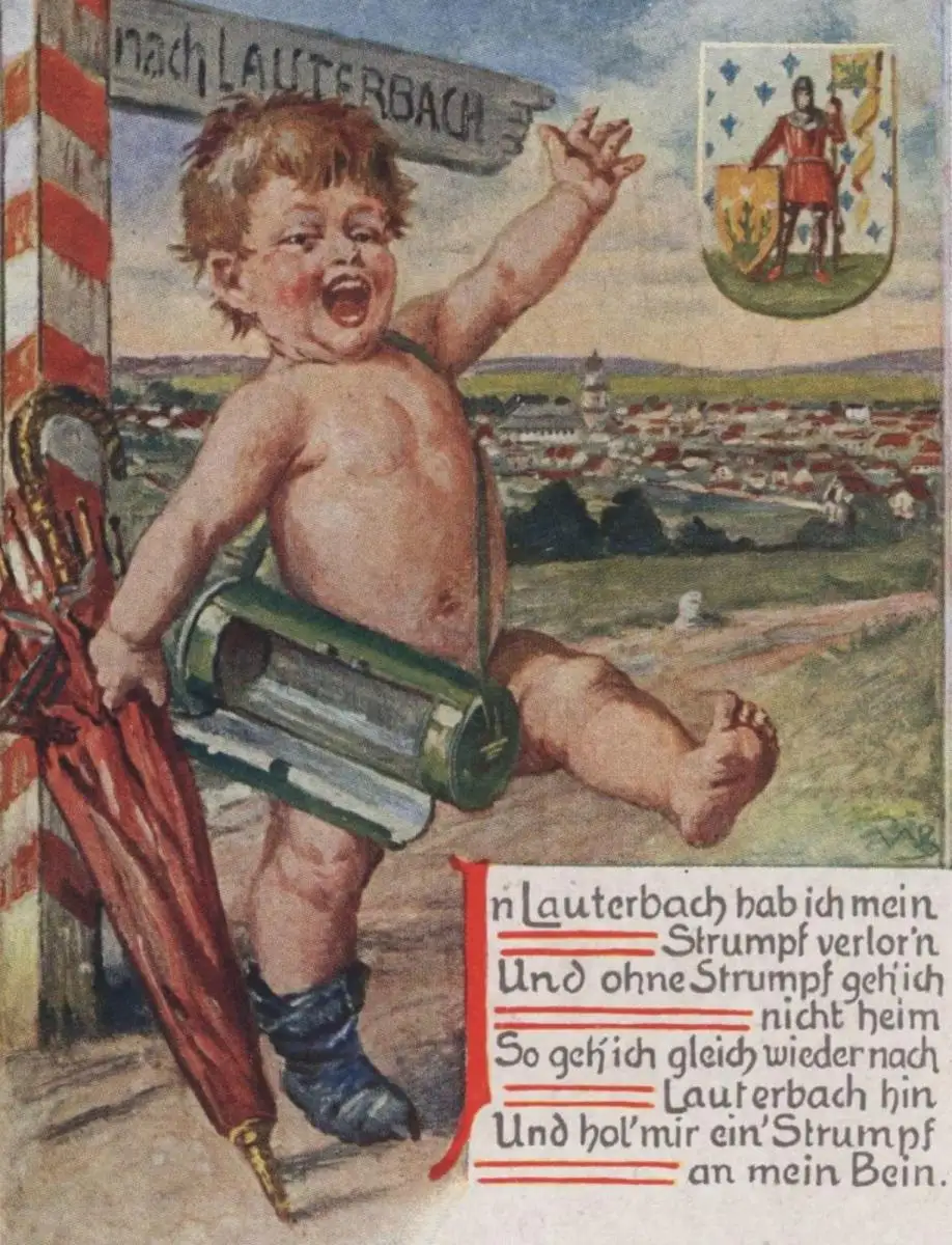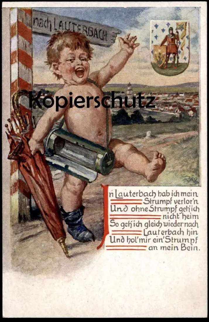 ALTE LITHO POSTKARTE NACH LAUTERBACH KIND MIT EINEM STRUMPF "IN LAUTERBACH HAB ICH MEIN STRUMPF VERLOR´N UND OHNE STRUMPF GEH´ ICH NICHT HEIM SO GEH´ ICH GLEICH WIEDER NACH LAUTERBAH HIN UND HOL´ MIR EIN STRUMPF AN MEIN BEIN."Verlag: Gustav Mandt, Lauterbach