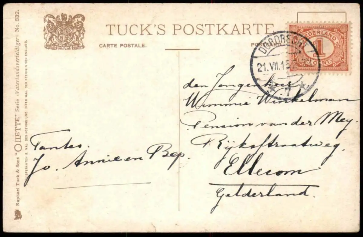 Gelaufen: 21.07.1915 mit Stempel Dordrecht nach Ellecom Gelderland