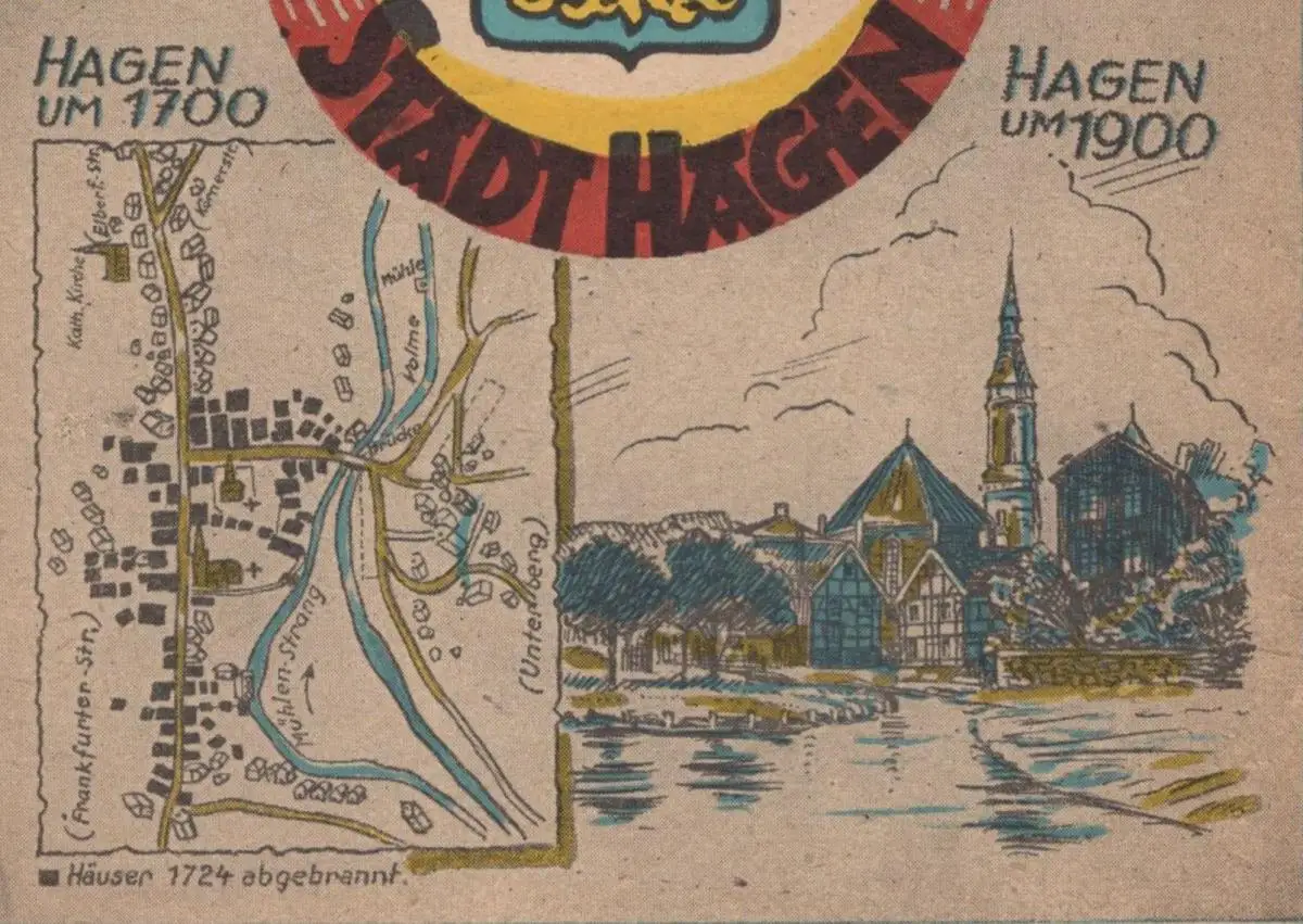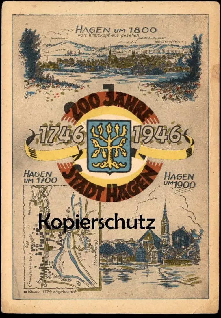 ALTE POSTKARTE 200 JAHRE STADT HAGEN 1946 VOM KRATZHOF AUS GESEHEN UM 1800 UM 1700 HÄUSER UM 1724 ABGEBRANNT UM 1900