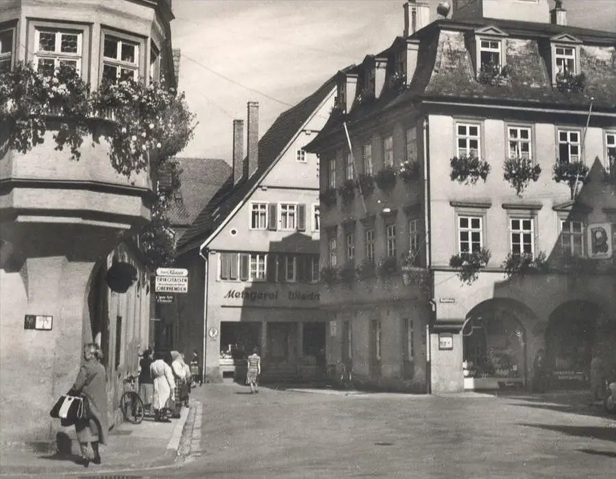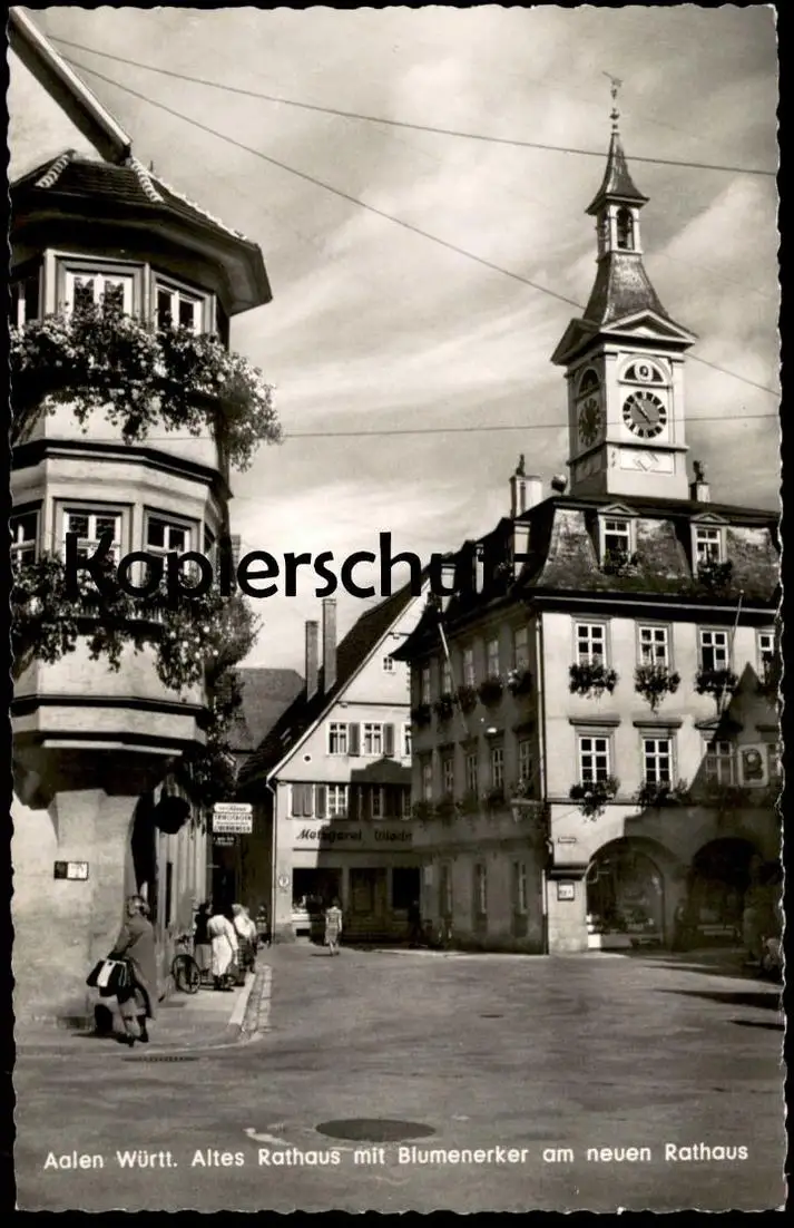 ALTE POSTKARTE AALEN WÜRTTEMBERG ALTES RATHAUS MIT BLUMENERKER AM NEUEN RATHAUS TRIKOTAGEN OBERHEMDEN KLAUS METZGEREI WIED Verlag: M. Aurich & Co., Heidenheim-Brz.