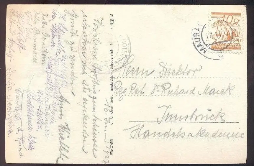 Gelaufen: 17.06.1927 mit Stempel Maurach sowie Hotelstempel Scholastika nach Innsbruck, Unterschriften Stockklauser Wieser Schindler Ornstein Loch Wolf Sailer Reitmeir Pfund Seidl Oberthanner