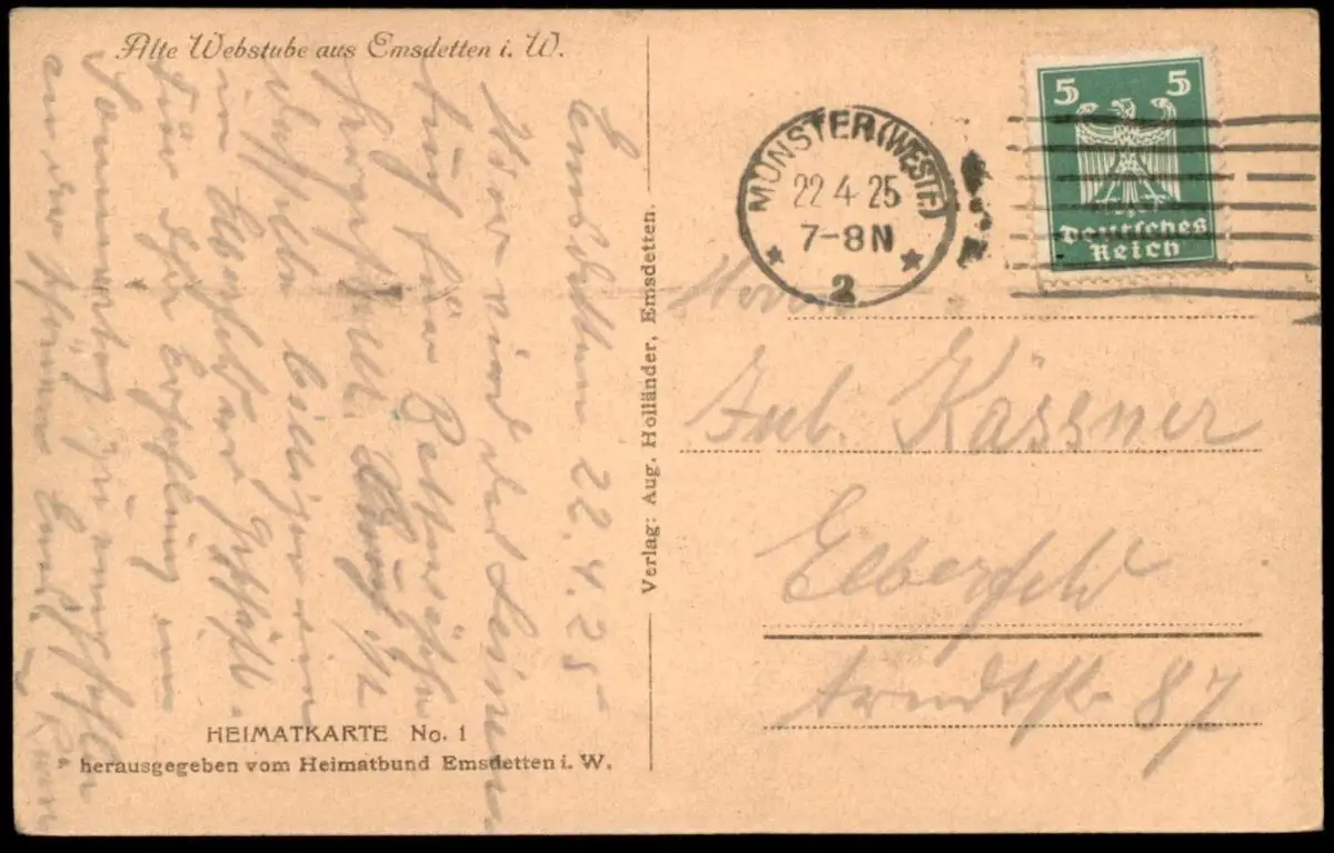 Gelaufen: 22.04.1925 mit Stempel Münster nach Elberfeld