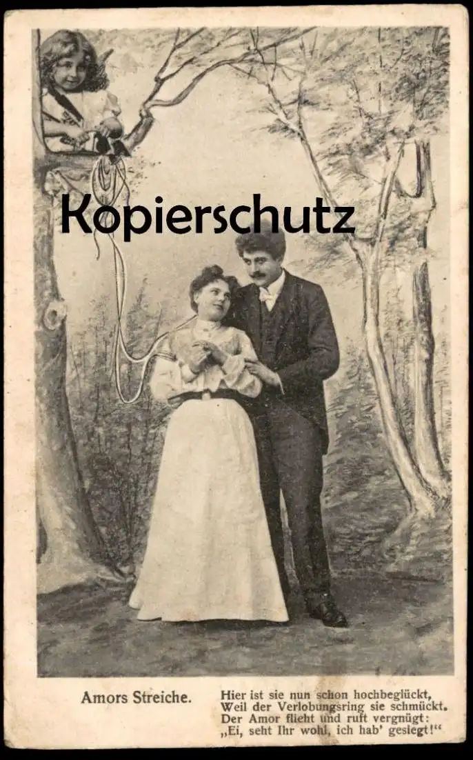 ALTE POSTKARTE AMORS STREICHE “HIER IST SIE NUN SCHON HOCHBEGLÜCKT, WEIL DER VERLOBUNGSRING SIE SCHMÜCKT. DER AMOR FLIEHT UND RUFT VERGNÜGT: “EI, SEHT IHR WOHL, ICH HAB´ GESIEGT!”