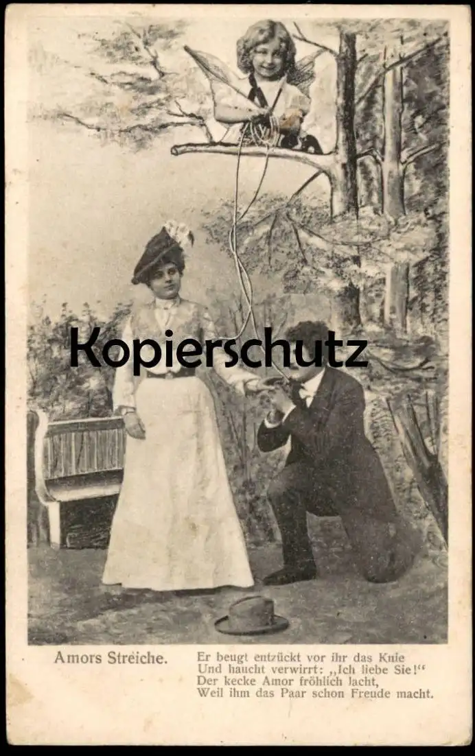 ALTE POSTKARTE AMORS STREICHE “ER BEUGT ENTZÜCKT VOR IHR DAS KNIE. UND HAUCHT VERWIRRT: "ICH LIEBE SIE!" DER KECKE AMOR FRÖHLICH LACHT, WEIL IHM DAS PAAR SCHON FREUDE MACHT.”