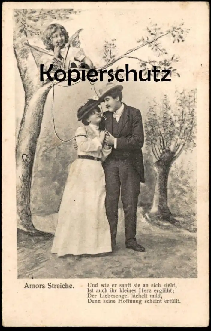 ALTE POSTKARTE AMORS STREICHE “UND WIE ER SANFT SIE AN SICH ZIEHT, IST AUCH IH KLEINES HERZ ERGLÜHT; DER LIEBESENGEL LÄCHELT MILD, DENN SEINE HOFFNUNG SCHEINT ERFÜLLT.”
