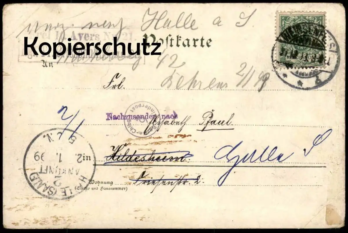 Gelaufen: 29.12.1898 mit Stempel Weissenfels nach Hildesheim, Nachsendestempel Berlin Charlottenburg nach Halle Saale zusätzlich Stempel Frei lt. Avers No. 21 Kgl. Pr. OrtsschulinspektionErhaltung (s. Scan): gut - mittel, linke untere Ecke bestoßen, rückseitig links oben Rand bestoßen / 918617