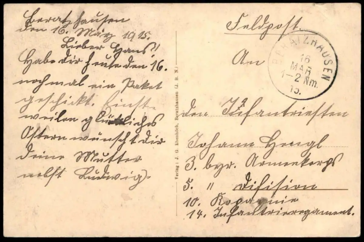 Gelaufen: 16.03.1915 als Feldpost mit Stempel BeratzhausenErhaltung (s. Scan): gut, linke obere Ecke minimal bestoßen / 915163