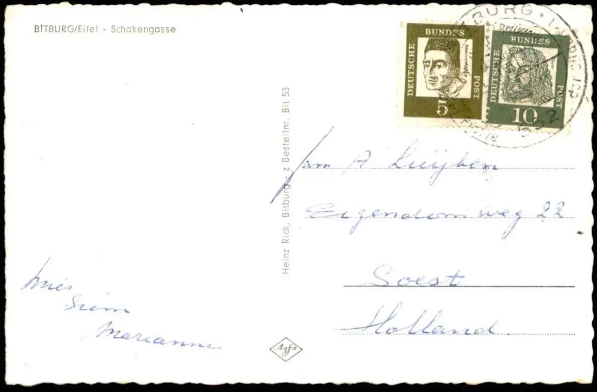 ALTE POSTKARTE BITBURG EIFEL SCHAKENGASSE LOUIS MÜLLER REKLAME TRINK COCA COLAVerlag: Heinz Rick, BitburgGelaufen: xx.xx.196x mit Stempel Bitburg nach Soest HollandErhaltung (s. Scan): gut - mittel, Ecken etwas bestoßen / 917660