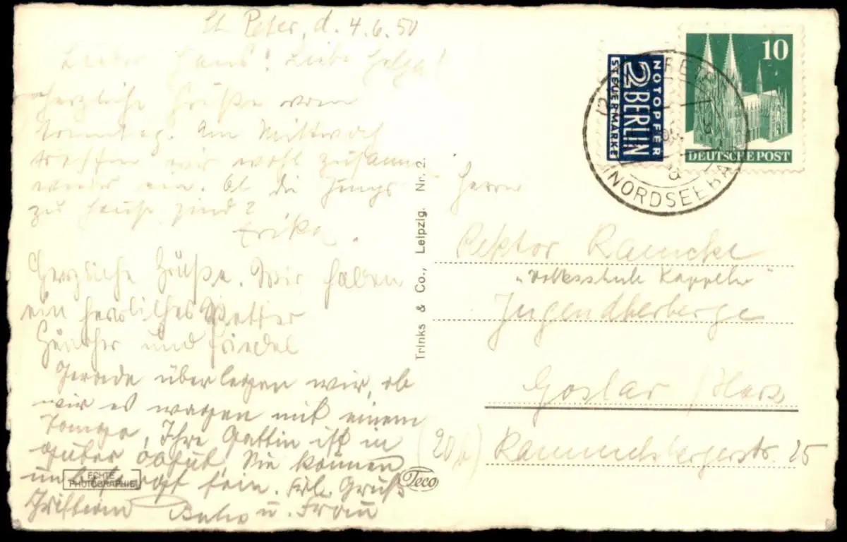 Gelaufen: 04.06.1950 mit Stempel St. Peter nach Goslar Harz