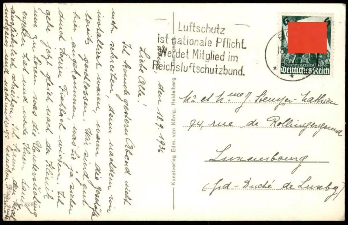 Gelaufen: 18.09.1936 mit Stempel Bonn “Luftschutz ist nationale Pflicht. Werdet Mitglied im Reichsluftschutzbund” nach Luxembourg