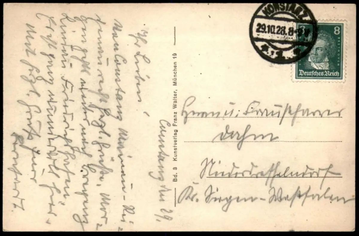 Gelaufen: 29.10.1928 mit Stempel Konstanz nach Niederdresselndorf